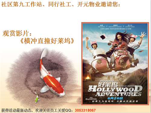 活动开始之前便吸引了大量员工的围观,大家纷纷询问放映的电影名字,社工耐心地给予大家回应:放映的电影是最近大热的《横冲直撞好莱坞》。该片由蒂姆·肯德尔执导,林诣彬和赵薇共同担当监制,黄晓明、赵薇、佟大为等主演,讲述了三个主角因为一包从天而降的犀牛角粉而卷入一场国际走私贩毒案,从此“二货天团”开始了一场真正惊险刺激而又感人的好莱坞冒险之旅。