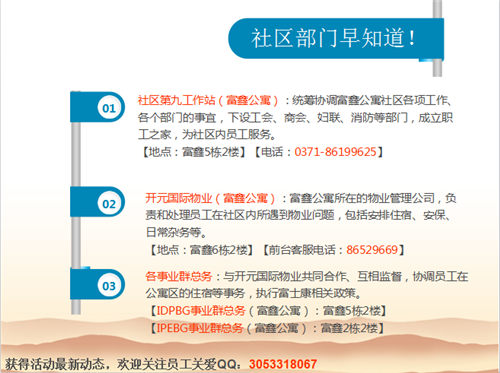 考虑到员工们对社区内的各部门的功能不够了解,新员工对社区环境不熟悉,所以同行社工在电影结束后,运用ppt为员工们介绍了社区各部门的职能、地址和联系电话,也方便新入职员工尽快熟悉身边环境,掌握身边的资源。同时,同行社工也借此机会,为新老员工介绍河南省民政厅的“富士康员工福康关爱计划”企业社会工作项目以及同行社工在项目运行中所提供的服务。