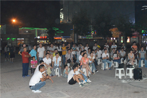 7月21日晚19时30分,夜幕降临,而此时在新郑富士康富鑫公寓5#楼下,同行企业社工站的社工已经在积极准备着今晚的电影沙龙啦。