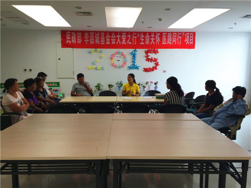 2015年7月29日,下午三点半,同行医务社工站于河南省肿瘤医院10号楼10楼阳光房开展了“我想更懂你”照顾者支持小组活动,此次小组活动共5节,意在帮助病友家属缓解心理压力,获取更多的癌症护理知识。小组活动第一节以“快乐起航”为主题,来自甲状腺头颈外科病区和肝胆胰外科一病区的8位病友及其家属参加了此次活动。