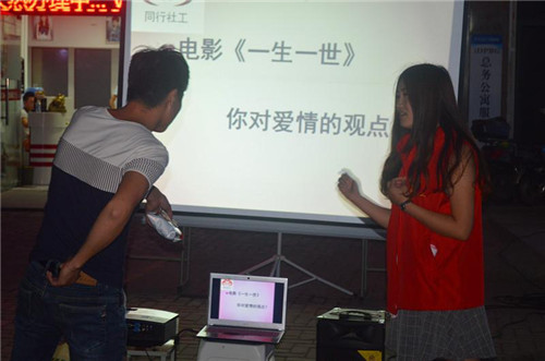 晚上18时许,企业社工站的社工们就开始布置会场,将投影设备进行校对、桌椅摆放好,在布置期间就有员工过来咨询晚上的活动,社工都一一做了回答,并真诚邀请大家的参与。本次活动以分享大家的爱情观念及七夕知识大作答为主题,社工首先进行活动相关环节的介绍,将问题抛给大家,希望大家认真思考一下自己的爱情观,然后播放了由高圆圆和谢霆锋主演的爱情电影《一生一世》,整个观影过程中,大家都是高度集中,被电影中唯美的画面及感人的情节所吸引,更是为最后遗憾的结局而惋惜。在电影播放完毕后,部分员工主动起来分享自己的观影感受及自己的爱情观,一些爱情观点则是引起了大家的共鸣。分享完爱情观后,就是最有意思的七夕知识大作答环节,问题难易结合,融有趣及知识于一身,现场员工情绪高涨,积极回答问题,社工们也准备了精美的小礼品作为回馈,一度把现在氛围推向高潮。