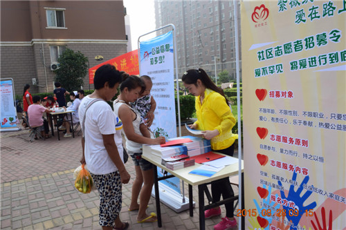 公益宣传区和志愿者招募区:社工为居民发放公益手册、招募社区志愿者