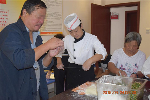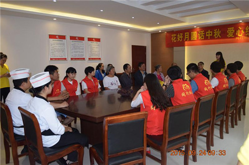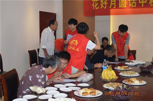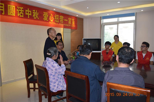 暖情的话语已经融化了在场的每一个人员,接下来是制作元宵和锅贴,活动共分成五组,由志愿者、低保户、社工共同组成,郑州未来康年大酒店的师傅们教授制作,一家人其乐融融的场面甚是欢乐,“这是谁做的?这么秀气”,原来是大学生志愿者男孩的身手,无不感叹!欢笑声、夸奖声、询问声,声声悦耳!在锅贴出锅的一刹那,哇,惊呆的表情,锅贴制作出来就像花一样放在盘子里,足以说明食物制作也是一门艺术。品尝过程猜谜语环节更是把活动人员的积极性、主动性推向了高峰:志愿者唱歌、低保诗朗诵、歌唱、同时社工也给大家演唱了应景的《但愿人长久》,低保户和志愿者一边品尝食物一边欣赏节目,大家纷纷表示,今年过了一个难忘的中秋节。“花好月圆话中秋 爱心纽带一家亲”活动在大家的掌声中结束了,活动取得了圆满成功!