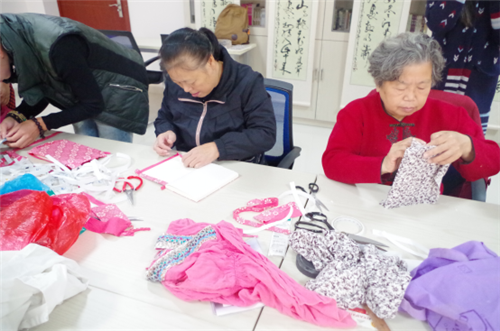 “小张,你看我拿的这件衣服行不行?”社工刚上班,牛大姐就拿着手工小组的原材料来到社工站了。天气虽冷,但四月天社区服务中心手工小组活动室却热闹非凡。一群来自轻工业学院创行团队的年轻人与社区阿姨有说有笑,进行布衣本的制作,利用废旧衣物对本子进行美化,经验丰富的阿姨与年轻有活力的大学生一起不仅毫无违和感,还激发了诸多创意,制作出了许多精美的布衣本。小组旨在培养一批社区手工达人,然后帮助社区内家庭困难女性,通过手工制作获取一定经济收入。