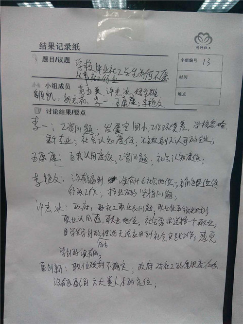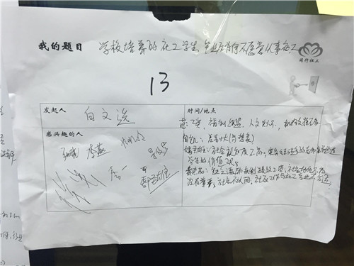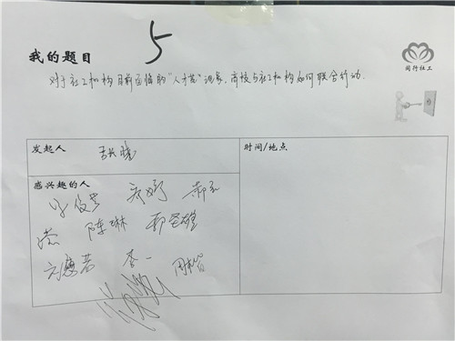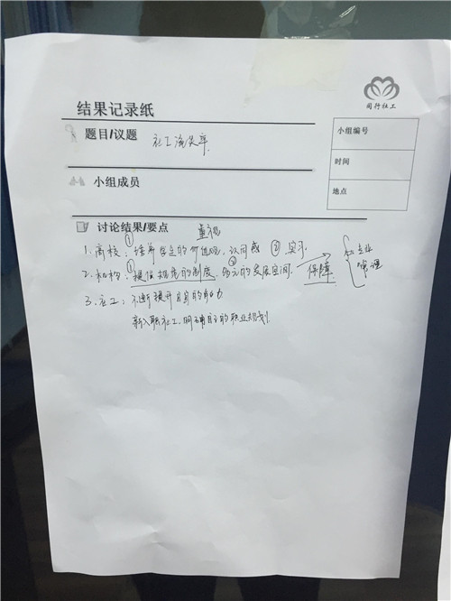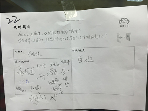 工作坊以开放空间会议形式举行,旨在创造开放的言论集市,激发集体经验与智慧,使参与者自由地寻找有共同议题的志同道合者,轻松地参与讨论与社会工作人才培养相关的各种话题。经过一下午的讨论,共形成讨论结果4份。而讨论并未结束,如何在这些讨论结果中找出重要的内容,进行共识的构建,并把共识性的东西形成决议或者行动计划,然后一起去付诸行动,才是更重要的事情。为回应与会者持续跟进此话题并在未来参与行动的需求,讨论者共同组建了一个“行动研究工作坊”微信群,未来会以工作坊形式和大家继续开展未完成的讨论并一起行动。此工作坊的核心精神是“参与、行动、改变、在一起”,宗旨是“一起在做中学习、一起对话、一起行动、一起解决问题。”