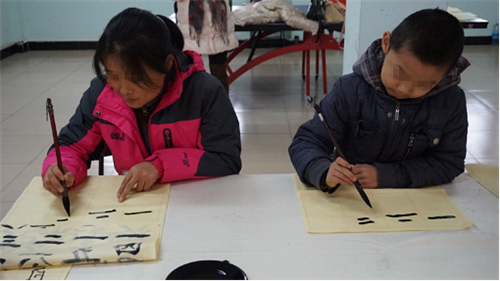 还没到活动时间就已经有家长和组员在活动室外等待,组员看到社工后急忙让社工开门,说自己已经等不及要开始练习毛笔字了,看到他那着急的样子社工和志愿者都笑了起来,赶紧开了活动室的门。很快家长和组员就到齐了,社工首先介绍了本节课的新老师,国家著名书法家耿老师,家长和组员听过社工对耿老师的介绍后都很期待本节课的内容。活动正式开始了,老师首先拿出了一张自己的书法作品,在场的家长和组员都被老师的这幅作品震撼了,这苍劲有力的字体,古朴雄浑的笔锋,无不显示着耿老师深厚的底蕴。欣赏过后,老师现场在纸上进行书写,边写边介绍书法要领,虽然写的是简单的一二三四五六七八九十这十个字,但这十个字中却包含着中华文化的博大精深和中华书法的魅力,这十个字更是书法的基础和精髓。组员们听过老师的讲解后开始了练习,经过前几节的书法练习,组员们对写毛笔字已经有了一定的基础,所以练习起来格外的得心应手,老师在每个组员身边进行指导,当看到一个组员写的“八”字的时候老师来到他身边进行专门的指导,看都组员一直掌握不到书写要领,就手把手的教组员在纸上写起来,在老师仔细的教导下,这位组员的“八”字写的越来越好,从字体架构和线条上都越来越有韵味了,旁边的家长看到自己的孩子有了这么大的进步很是高兴,也不再像以前那样一直批评了。还有一位家长是和自己的孩子一起学习书法,虽然写的不好但还是坚持和孩子一起学习,组员看到妈妈一直陪在自己身边也很努力的练习着,这对母子俨然成了书画班的模范母子。