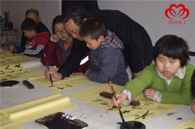 迎着春风,社工早早便来到了教室,为大家准备好笔墨纸砚,热情迎接每位组员的到来。在签完到后,我们的书法课就正式开始了。书法老师先让每位组员自由发挥,写一副作品出来。有的组员苦思冥想,有的认真临摹,别看我们的组员年纪小,练起书法来可是毫不含糊,一会儿就写了满满一张,老师分别点评了了每位组员的作品,并给大家做了正确示范。紧接着,傅老师给大家讲解了如何去握笔,用笔的技巧,并告诉大家要勤于练习,使自己的手腕变得有力度,家长也在一旁听的跃跃欲试,社工便邀请家长也参与到了练习中。傅老师着重给大家演示了如何调磨,方便大家在家中练习。为了激发组员的学习兴趣,社工特意邀请傅老师写几幅作品,让大家欣赏书法艺术的美。傅老师分别给大家演示了楷书、行书、草书、隶书、魏碑、金文等多种书法形式,引得大家一阵阵赞叹。中国书法的精妙绝伦也更加坚定了组员们学习的信心,练习起来更有劲头了。