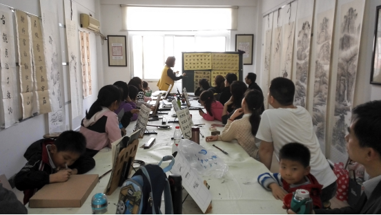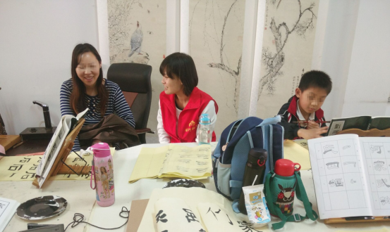 在活动的开展过程中,大家逐渐熟悉,孩子们也成了好朋友,相互打着招呼进入教室,这次大家主动挑选出自己的得意之作,然后把自己和家长的作业整理好交给社工归档,邹老师到达之后也把自己作品让大家帮忙挂起。到了上课时间,邹老师看大家都在欣赏自己的作品,于是从国画讲起,来点明练字的过程中可以达到个人对毛笔掌握的熟练度,深深地奠定绘画的基础;并且告诉大家不论是写字还是画画,以后都要形成自己的风格,就算临摹的再好也是别人的原创;也提到练字能让人稳定心神,在写字、画画的过程中会忘记所有烦恼,我们是快乐的。然后在大家期盼的眼神下开始点评作业,看到大家写的落款格式不一,开始告知大家这节课的主题就是落款格式和字体。在讲解了每位同学和部分家长的作业后,表扬了作业写的多的、好的,选出每幅作业中好的字,着重表扬了我们的一位五岁的小组员。最后开始了我们的课堂练习,邹老师轮着给大家指导字的技巧,社工和家长也不断监督每位组员的练习情况。在课堂进行过程中,社工和学生一起练习,相互督促。社工也向家长询问了孩子的感受,了解他们自己的成长方面。临近下课,大家主动去找邹老师请教落款格式和字体,邹老师一一为大家留下各自名字落款的几种方式,家长看着一些组员已经有了自己的印章,也想要为孩子定制他自己的印章。