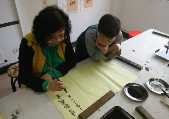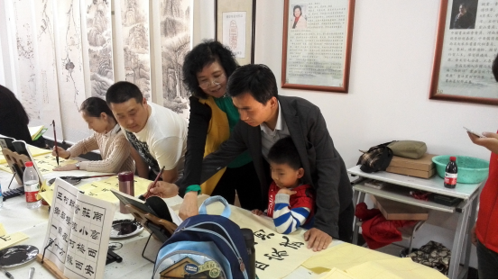 邹老师和家长一起指导组员写字