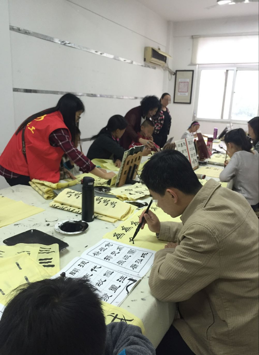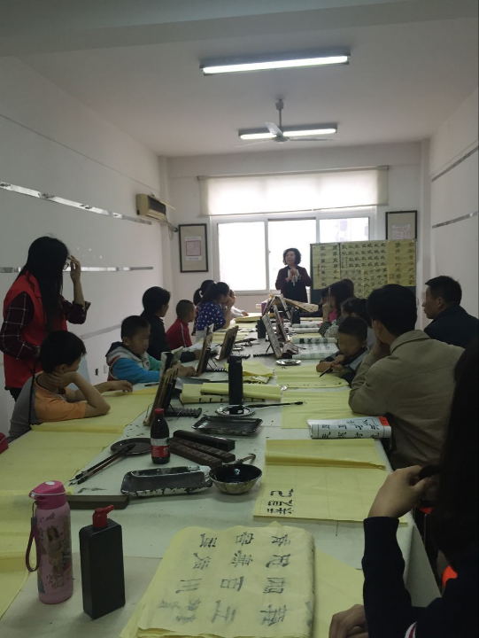 别看组员虽然年纪小,可写起字来可是兴致勃勃,一点也不比大人差,虽然书法学起来是个细致活儿,可小组员们仍旧不骄不躁,十分耐心地写着字,在家长的陪同下,写了一页又一页,更值得赞扬的是家长也同孩子一起练习,给了孩子极大的鼓舞和坚持下去的动力。在练字的过程中,社工主动询问组员们的兴趣,组员和家长们也开心的和社工讨论着。今天主讲的老师是邹老师,邹老师虽是大家,可是仍旧有亲和力又不失为师者应有的严肃与认真。老师积极鼓励写得好的组员,指导在书写姿势上有错误的组员,又让人觉得老师十分慈祥和蔼。中国文化博大精深,有许多值得我们学习与探索的地方,书法,作为几千年来一脉相传的文化传统,我们应该积极学习,得以发扬和继承。