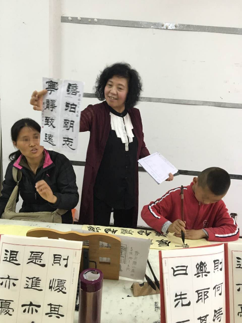 虽是下雨天,社工仍旧早早的来到工作室,为大家准备好笔墨纸砚,热情的迎接每位组员的到来。正式签完到后,我们的书画课正式开始了。首先,书法老师让每位组员准备好要点评的自己的作业,在社工和家长的帮助下依次挂在展板上,在组员的期待中,老师依次点评了各位组员的作业,指出优缺点,大家都十分赞同老师,积极找出了错误,并在课堂中反复练习,以达到更好。