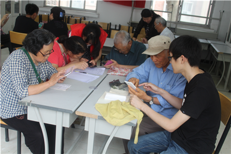 这次课程社工邀请到河南省轻工业学院的大学生作为志愿者参为老人们讲解手机的使用,所以每两三位老人便可以有一个社工或志愿者进行专门指导。在安装了微信之后,大家先一起注册了微信号,有了上一次教学的基础,这次老人们显得得心应手多了。在社工和志愿者的详细讲解下,老人们尝试了微信的不同功能,虽然不是很熟练,但是脸上还是洋溢了满足的笑容。