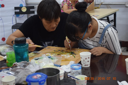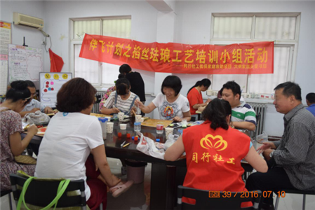 7月10日下午,同行社工低保项目联合金水区“助困心光”大病家庭救助项目举行的掐丝珐琅工艺培训小组活动第六节在机构活动室顺利开展。随着学习的深入,学习的难度也在不断增加,本次活动的主要内容是学习上色。