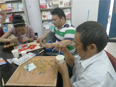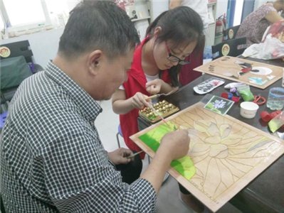 下午两点半,大家便像商量好的一样早早来到机构活动室了。阿姨们帮助社工挂条幅,准备材料。下午三点,课程正式开始,大家仔细的对比成品图认真的调色,上色,做的越来越顺手。“老师,这个颜色怎么调?”“老师,我看不出这个到底是什么颜色?”“大家注意,调色的时候要一点一点慢慢来,不要着急,认真对比下颜色。”在得到老师的悉心指导后,大家便迅速掌握了上色的技巧。看到大家做的漂亮的工艺画,社工也忍不住想要加入其中。“叔叔,我来帮你!”“那太好了,来,咱俩一起做!”在社工与组员的共同努力下,不一会儿,原本空白的一幅画便变得五彩斑斓了。今天,已经有组员率先完成了自己的作品,大家看到美丽的画作,赞美的同时也暗暗在心里为自己加把劲。 随着小组活动的开展,社工的理念也在潜移默化影响着组员。“对待孩子你要多鼓励!”一位叔叔向阿姨说道。原本沉默寡言的叔叔敞开了心扉并且开导起了别人,这样的场景越来越多,社工很开心大家在学习技能的同时也收获了温暖与感动。