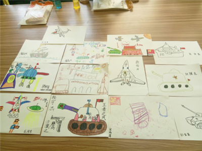 在书记对活动进行简单的介绍后,社工和志愿者们将绘画材料分发给每一个小朋友,开始正式手绘。起初,小朋友们不知从何下手,在志愿者和社工的讲解下,思维慢慢打开,彩笔在他们的手下流畅地勾勒出各种线条,嘴里还不停地说“我喜欢坦克,我长大要开坦克打日本鬼子”“我要开飞机,丢炸弹”......天真的孩子们幻想着自己有一天能够为国家效力。三十分钟过后,小朋友们富有创造力的作品也出炉了:有飞机、有战舰、有坦克、有天安门,印象最深的是其中一个小朋友用英文“I Love China”表达了自己对祖国的敬爱。