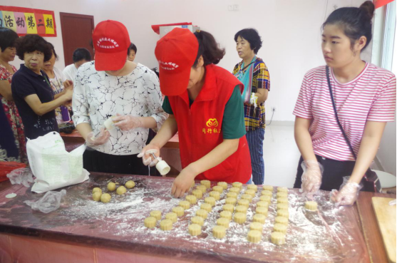 上午9点活动正式开始,30分钟调馅,接着和面,6个人每人一盆,接下4人包馅,2人出饼,最后4人去烘烤,下午1点包装,4点时社区、社工、志愿者一起去困难家庭送去节日慰问。调馅—和面—包馅—出饼—烘烤—包装—慰问,下午6点时整个流程结束。