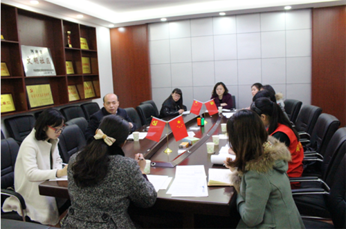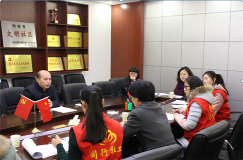 参加此次会议的有:郑州市民政局社会工作处王自兴处长、张萌、惠济区民政局社工科刘子僅、刘寨街道办事处工会王华主席、刘寨街道办事处民政所彭华所长、清华园社区赵卫华主任、郑州市金水区同行社会工作服务中心王莹副理事长及清华园社区党群综合服务中心全体项目社工等。清华园社区党群综合服务中心成立于2016年11月,是郑州市民政局购买的首批党群综合服务中心项目之一,也是惠济区首家党群综合服务中心项目,由郑州市金水区同行社会工作服务中心运营。王自兴处长一行首先参观了社区的基础设施、党史长廊等,并与正在社区党群综合服务中心参与活动的党员和社区居民亲切交谈。之后,项目社工向王处长汇报了清华园社区党群综合服务中心项目自入驻以来开展的相关服务活动,并着重介绍了在前期需求调查基础上,针对社区不同群体开展的“党群一家亲计划”、“俏夕阳康乐计划”、“乐朝阳成长计划”、“亲亲家园暖情计划”、“阳光守护计划”等五大服务计划。